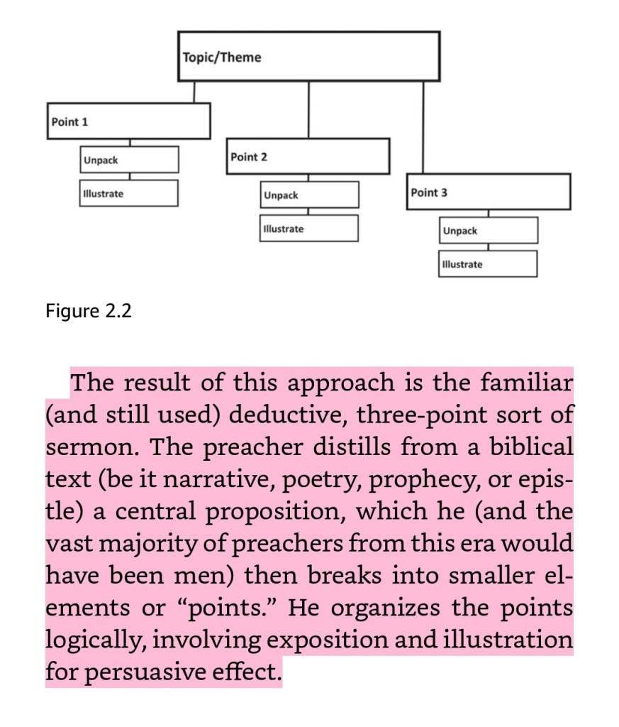 This was Graves’ way of indicating the waning effectiveness of the expository and deductive sermon that names a thesis that will be proved, offers points to defend that thesis (often three!), and then restates the thesis after proved. Allen and La Ferle presented it this way: