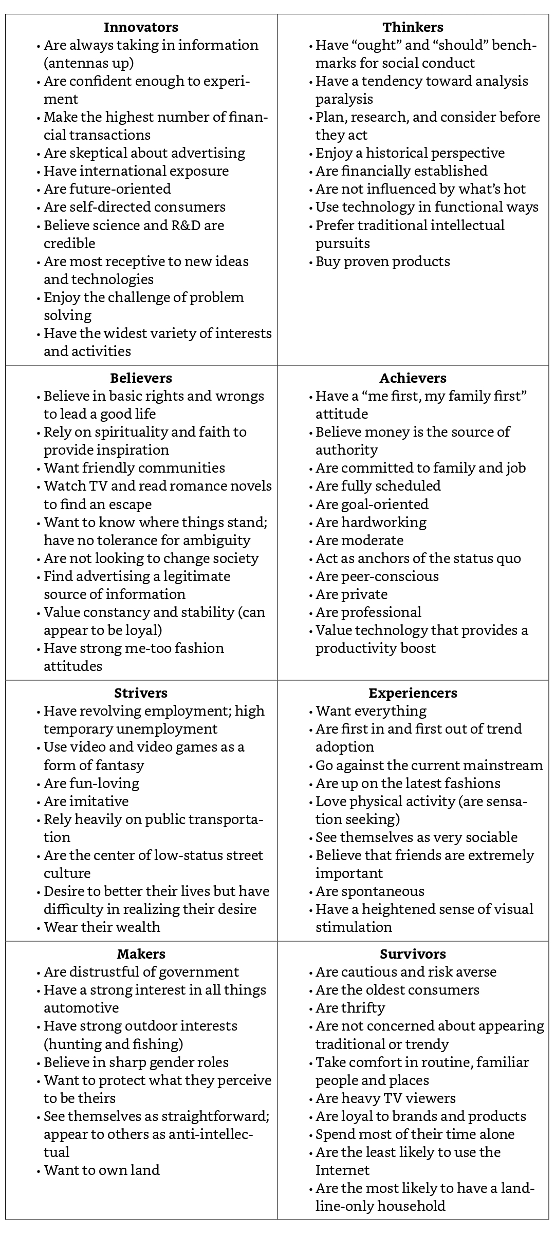 At this point, the book shifts into practical suggestions and case studies that emphasize the importance of story-telling and working out our creative muscles as pulpit ministers. Combining the emphases and suggestions of the great inductive preachers and professors of the 21st Century, the authors drive home the synthesis of preaching and advertising in what is called “the sticky story.” The sticky story is the story that leaves with you when you leave the presence of the story-teller. It is the story that taps into your intellect and your emotions and allows to to experience the setting and senses of the story. Contrast this with the deductive sermon driven by facts and proofs, in which story plays the supporting role, and you can see why so many preachers have become so boring, and why so many advertisers reserve millions of dollars for continually testing their brand against the most current psychographics. Allen and La Ferle include those psychographic groups as follows: